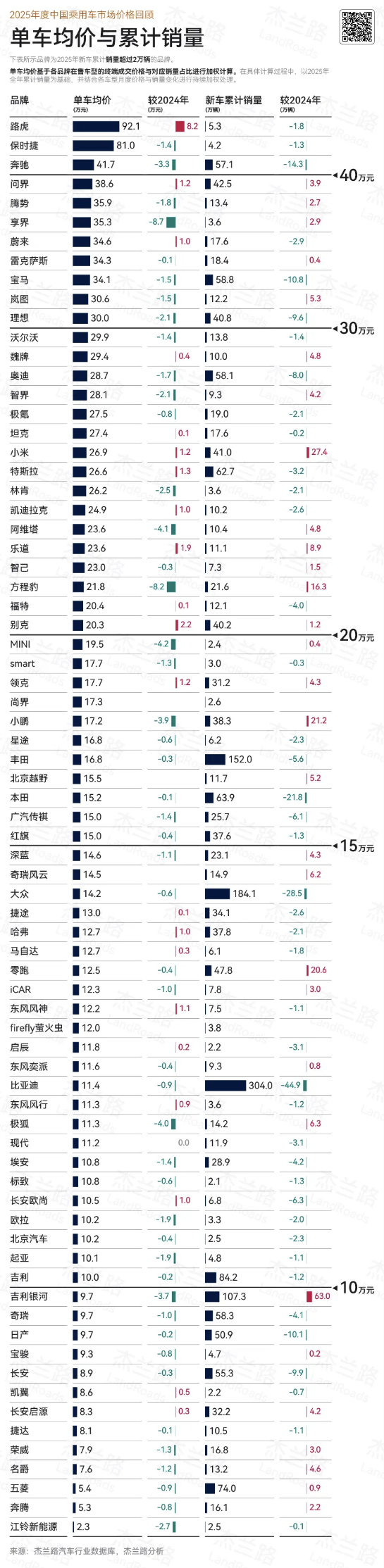 近日,杰兰路发布《2025年乘用车品牌单车成交均价与销售额报告》,报告显示,2025年问界单车成交均价达38.6万元,位列新势力品牌成交均价第一名;同时,全年累计销量超42万辆。成交均价与销量连续两年实现增长,形成“量价双升”昂扬曲线,反映出问界“智慧重塑豪华”的品牌理念与长期价值已获得市场广泛认可。