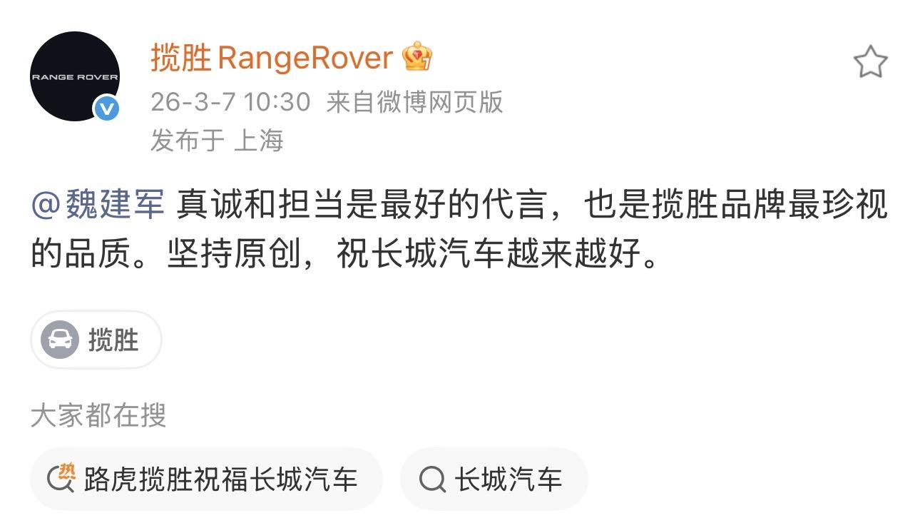 有趣的是,在发布会后,路虎品牌官方在微博上第一时间送来的祝福,也算为魏牌V9X的保定美学首秀增加了一份圆满。