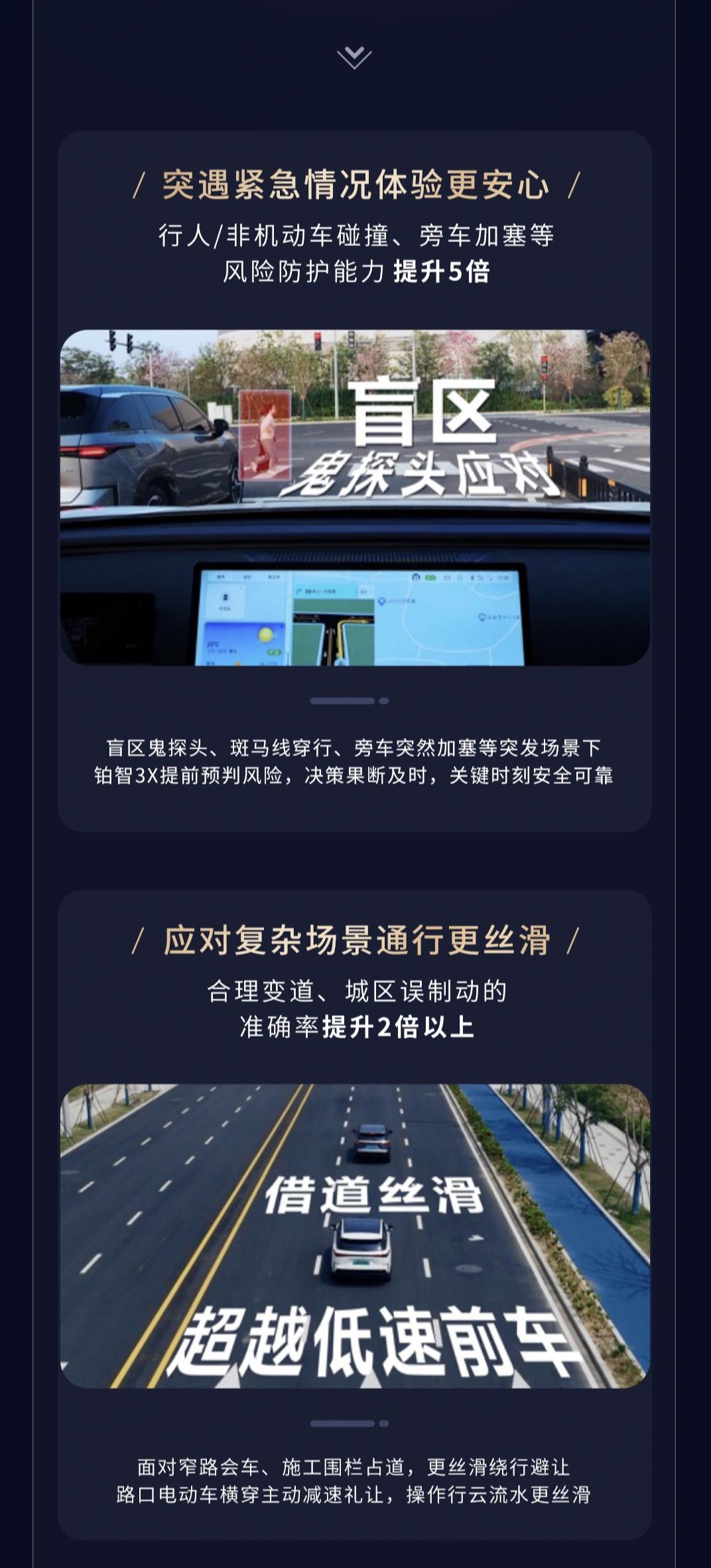 通过强化学习+闭环训练体系持续进化,让智驾决策更安全、舒适,做到让智能驾驶接管以后也能稳如“老司机”。此次OTA 3.0升级后,面对行人、非机动车横穿、旁车近距离加塞等突发险情,系统风险防护能力提升5倍;面对复杂场景的通行将会更加稳健,诸如城区拥堵、人车混行等复杂场景丝滑通过、变道更合理,智驾自主接管准确率提升2倍以上。