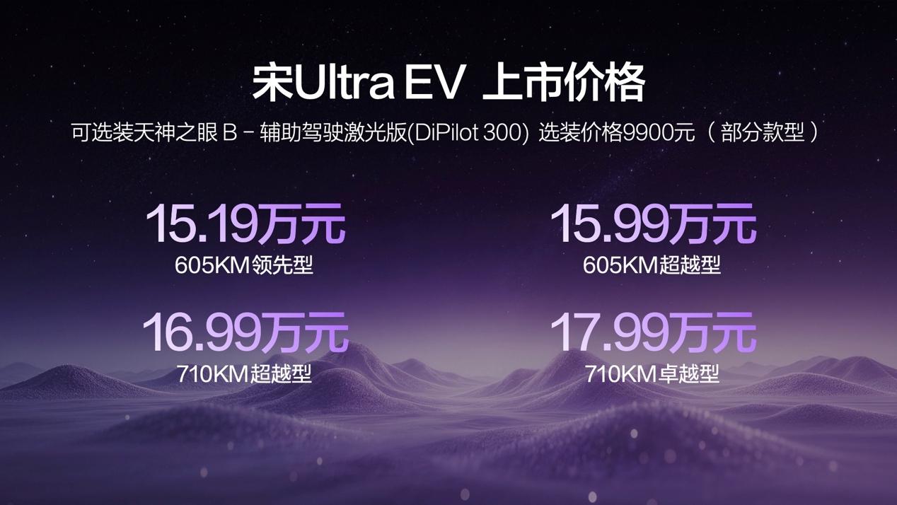 最后跟大家唠唠最关心的定价和购车权益,买家用车,性价比肯定是绕不开的。宋Ultra EV一共出了4款车型,官方指导价15.19万-17.99万,分别是605KM领先型15.19万、605KM超越型15.99万、710KM超越型16.99万、710KM卓越型17.99万,刚好覆盖15-18万的主流家用预算,家用纯电SUV赛道实力印证。
