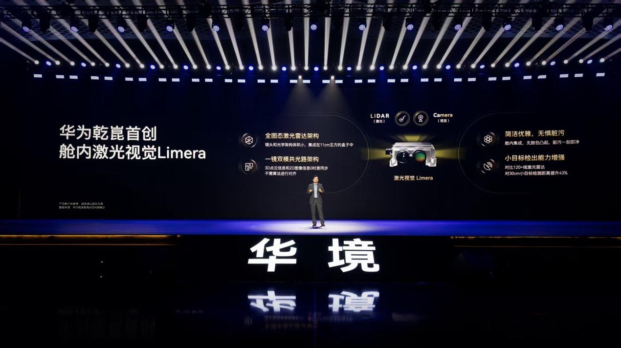 新车还是首批搭载华为乾崑首创舱内激光雷达Limera的车型,采用全固态激光雷达架构,把雷达集成在车内,不仅好看不突兀,还能避免外置雷达容易脏污遮挡的问题。华境S的一镜双模共光路设计,能让3D点云和2D图像实时同步,对30cm高的小目标,检出距离能提升43%。