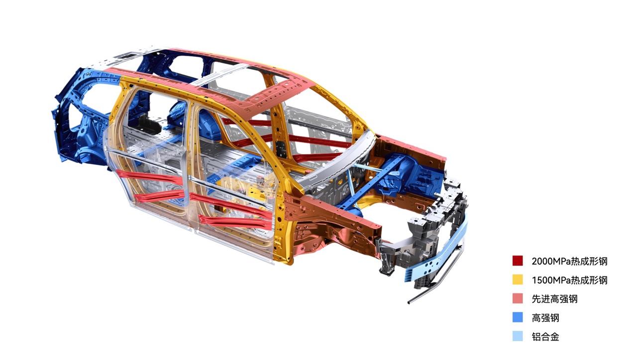 华境和宝钢一起研发,用了2000MPa核潜艇级的超高强钢,搭配一体化热成形技术,还有全球首发的一体式热成形前地板骨架,以及行业领先的一体式热成形双门环,打造出五纵十一横的底部结构和六环笼式车身,四门还装了八处2000MPa的防撞梁。
