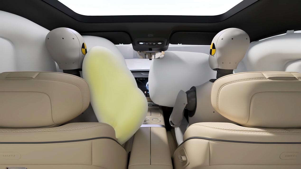 被动安全方面,华境联合奥托立夫和延锋,装了同级顶配的双腔体远端气囊,用9气囊14腔体,把车内保护得很全面,超长侧气帘能覆盖到第三排,保压时间长达6s,给全车人都能提供360°的碰撞防护,不管坐在哪一排都能放心。