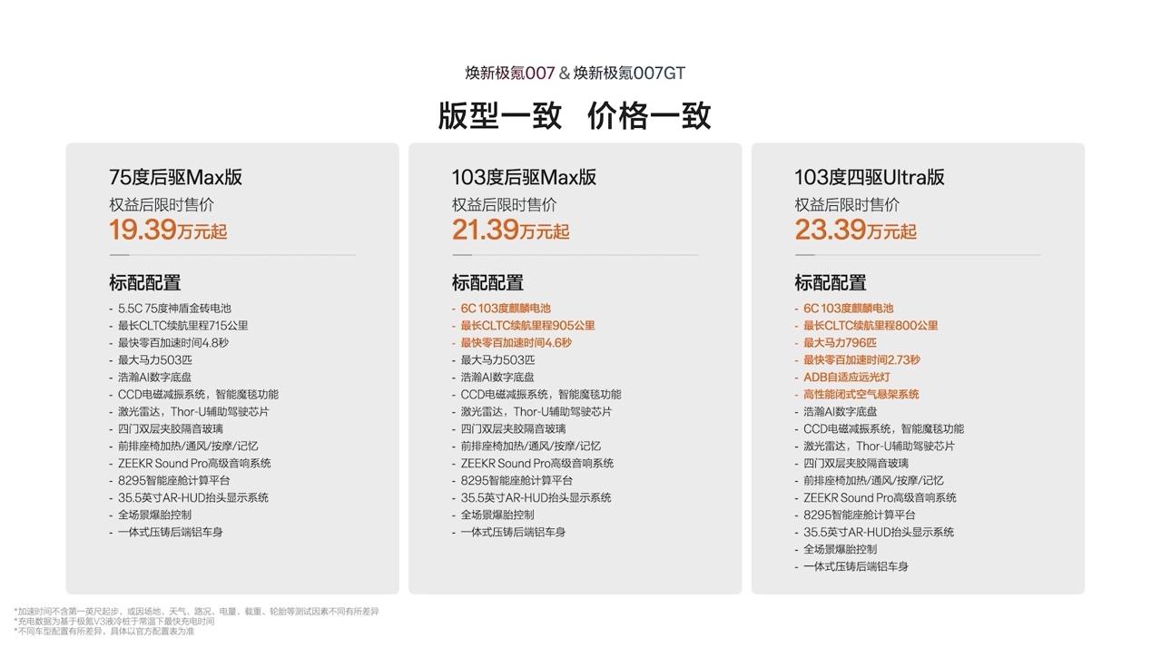 其中焕新7系包含两款车型,焕新极氪007和焕新极氪007GT,一款是豪华运动轿车,一款是科技猎装轿跑,上市权益后的限时价都是19.39万到23.39万,能满足年轻人不同的出行需求。两款车都升级到了900V高压架构,三电性能的提升很明显。