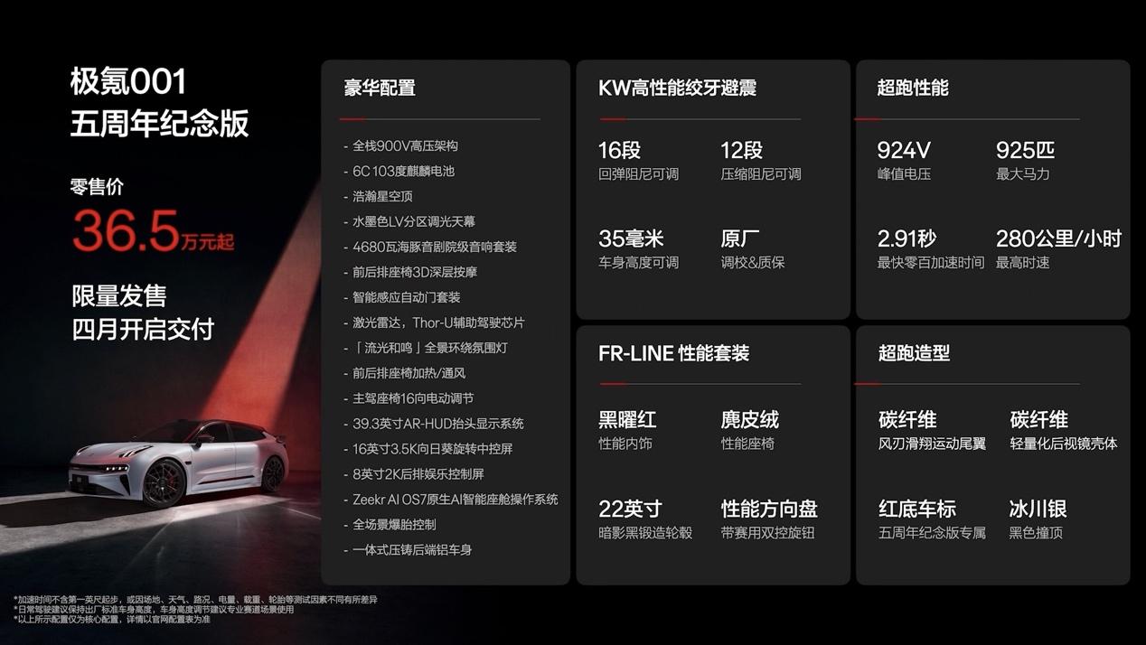 极氪001五周年纪念版基于新一代全栈900V高压平台打造,搭载680千瓦高性能四驱系统,最大马力925匹,最大扭矩913牛米,零百加速只要2.91秒,最高时速能到280km/h。再加上103度麒麟电池和6C超快充,既能有超跑级的性能,补能也很高效。
