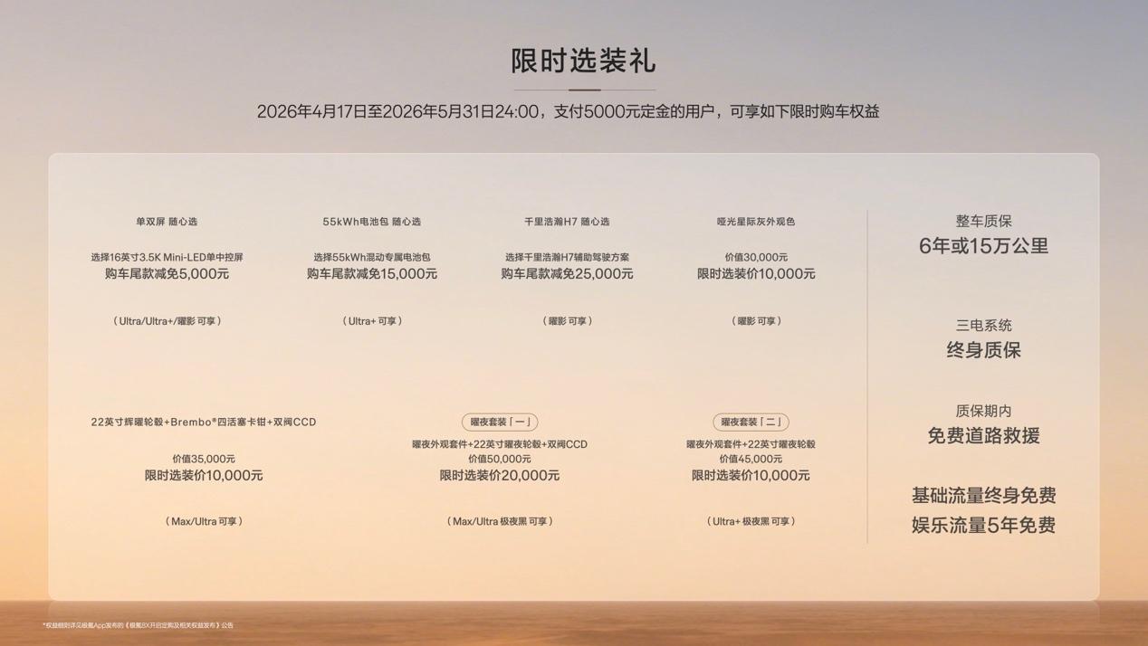 针对不同用户的个性化需求,极氪还推出了多项灵活的限时选装政策。用户可根据自身需求选择中控单屏、不同辅助驾驶方案或电池容量,对应获得不同金额的尾款减免。老车主还能享受专属增换购权益,包括免费充电或极分赠送,进一步提升品牌用户的粘性。