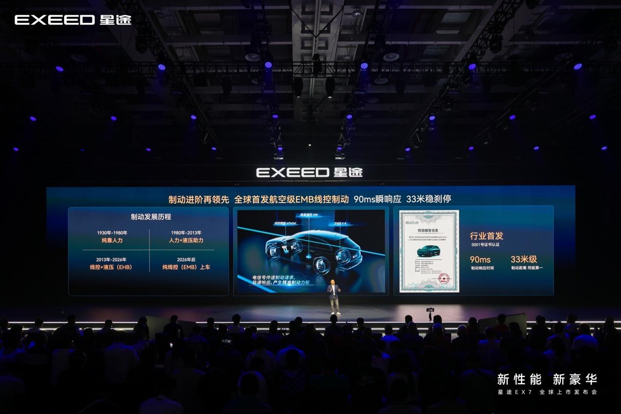 星途EX7最吸引人的技术亮点,就是全球首发的车用航空级EMB纯机电线控制动系统。