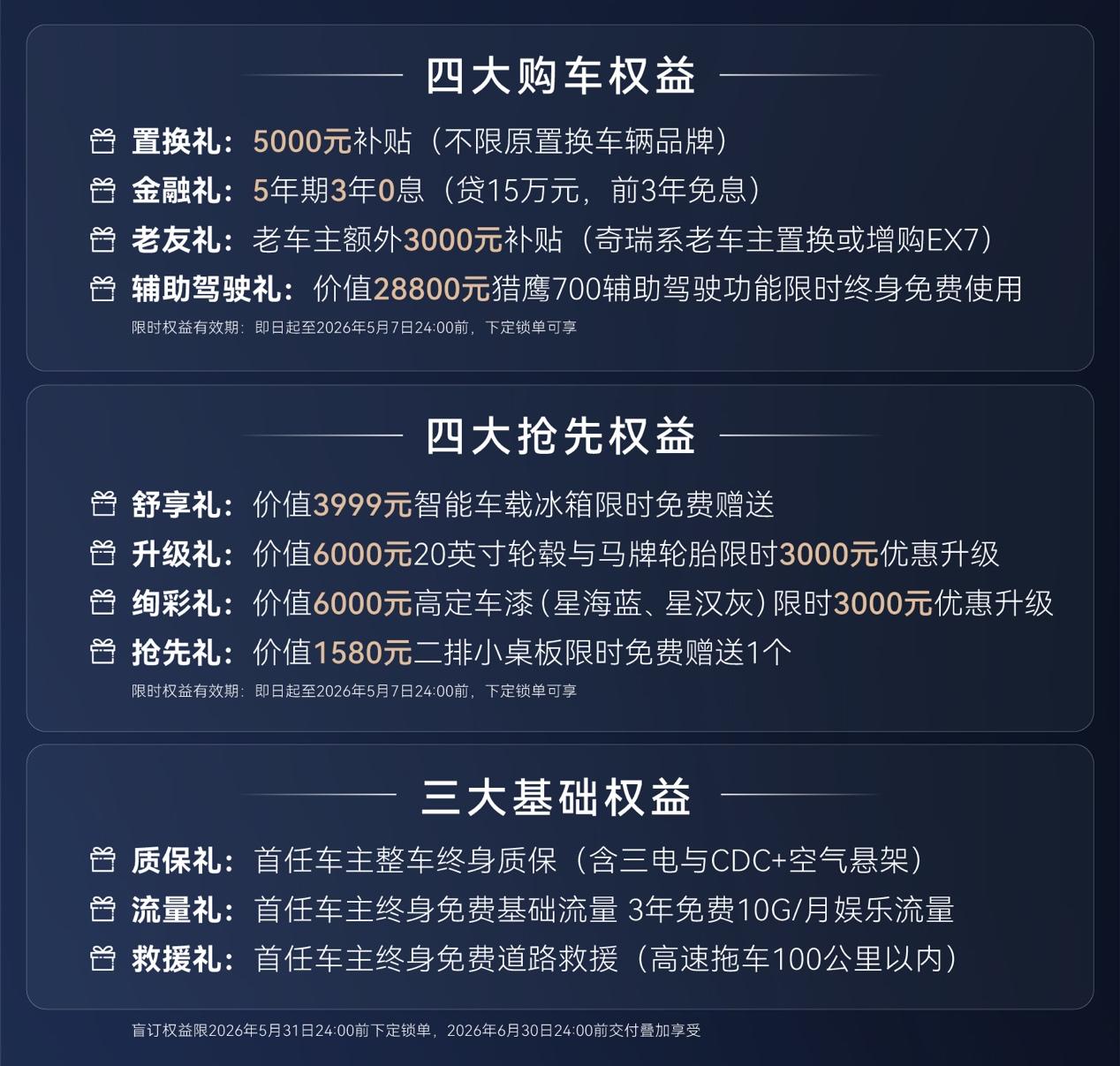 四大抢先权益有舒享礼、升级礼、绚彩礼和抢先礼,前3000名购车的用户,能拿到不少专属福利。三大基础权益则是终身质保、免费流量和免费道路救援,后续用车也能更省心。
