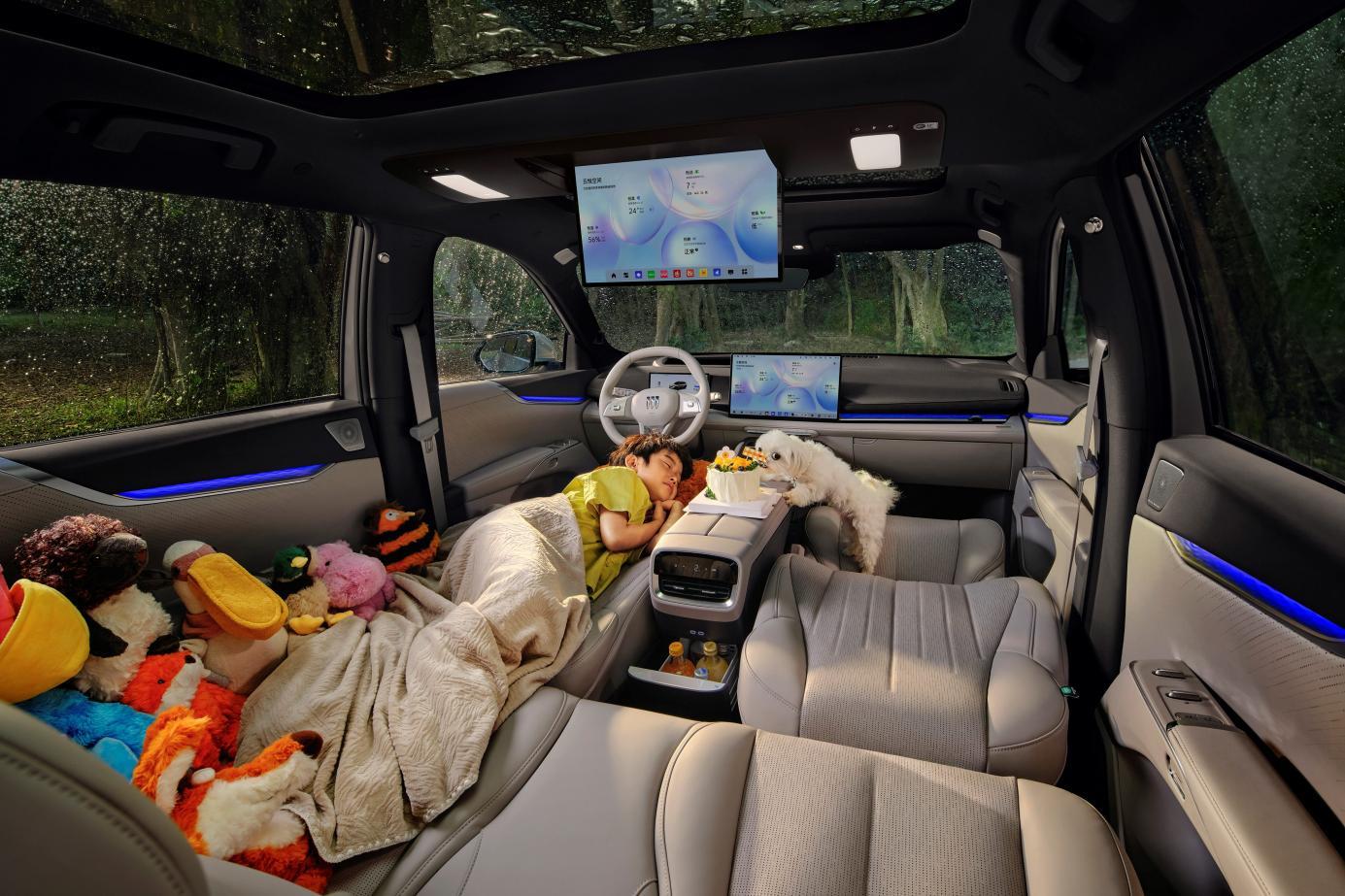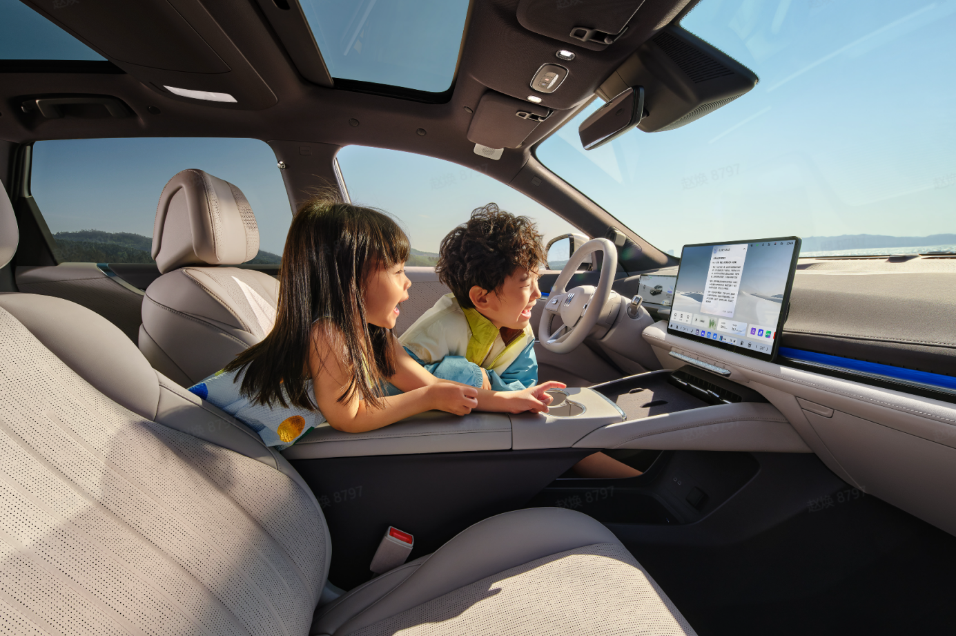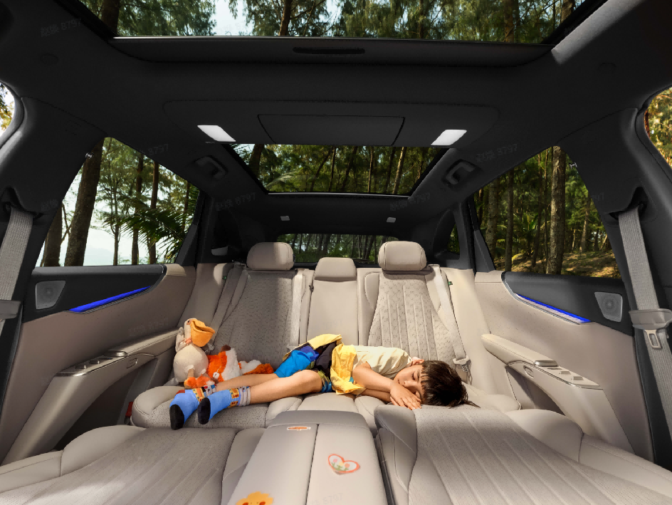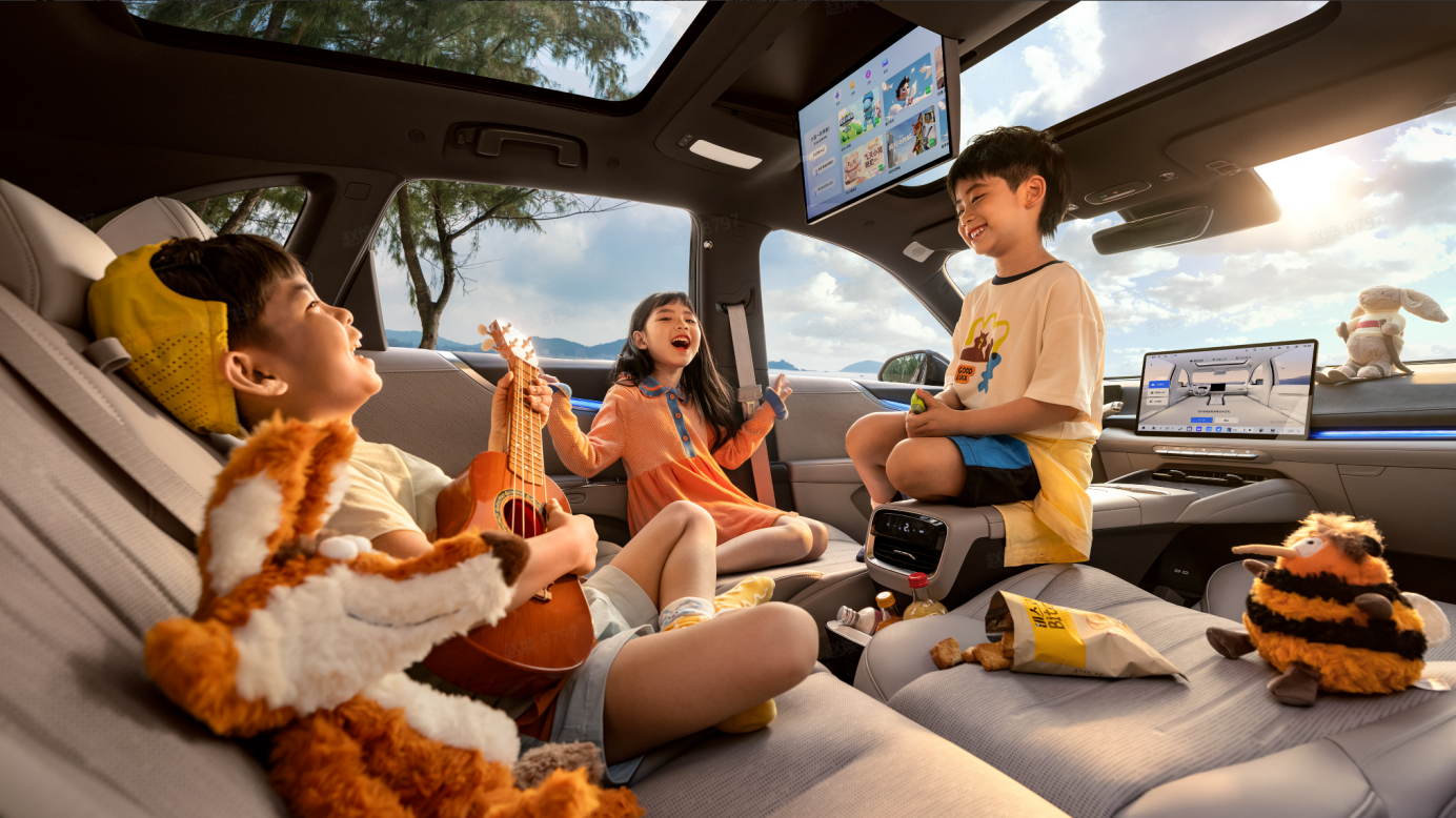 值得一提的是,所有和儿童相关的配置,全都是全系标配,不用额外花钱选装。像银离子保鲜冷暖箱、100%全遮光隐私遮阳帘、带后向儿童座椅头部保护区的儿童保护设计气帘、智能儿童守护模式,还有四音区独立语音识别这些功能,入门车型也一样能拥有。