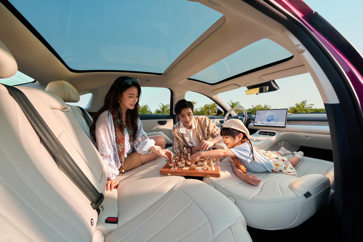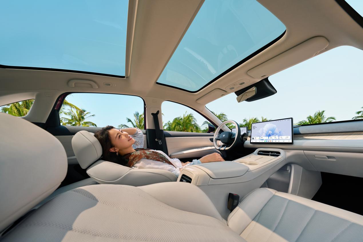 专属防晕车调校优化了起步、加减速逻辑,能降低乘车时的眩晕感。前排座椅可一键放平,与后排衔接形成1.8米纯平空间,满足午休、露营等场景使用需求。