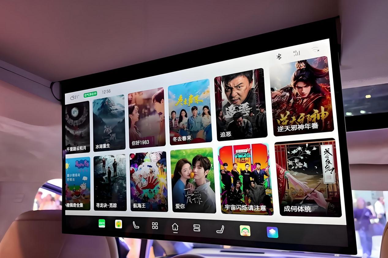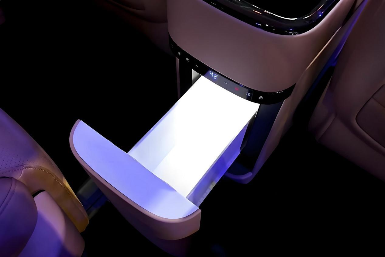 后排是整车的功能核心。车顶配备一块可翻折的17.3英寸后排吸顶娱乐屏。两个独立座椅内侧均设有可收折的后排小桌板。此外,中央扶手箱后部配备了一个压缩机式车载冰箱,支持制冷与保温功能。