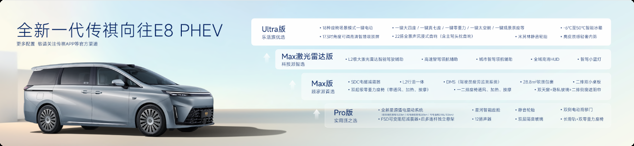 从车展实车呈现的产品力与公布的预订信息来看,全新传祺向往E8 PHEV在20万级家用MPV市场展现了清晰的竞争力。其通过灵活的空间、针对家庭的实用配置、以及低至3.98L的亏电油耗与超1500km的综合续航,精准匹配了家庭用户的核心需求。四款配置版本与务实的价格策略,为其市场表现提供了更多可能。